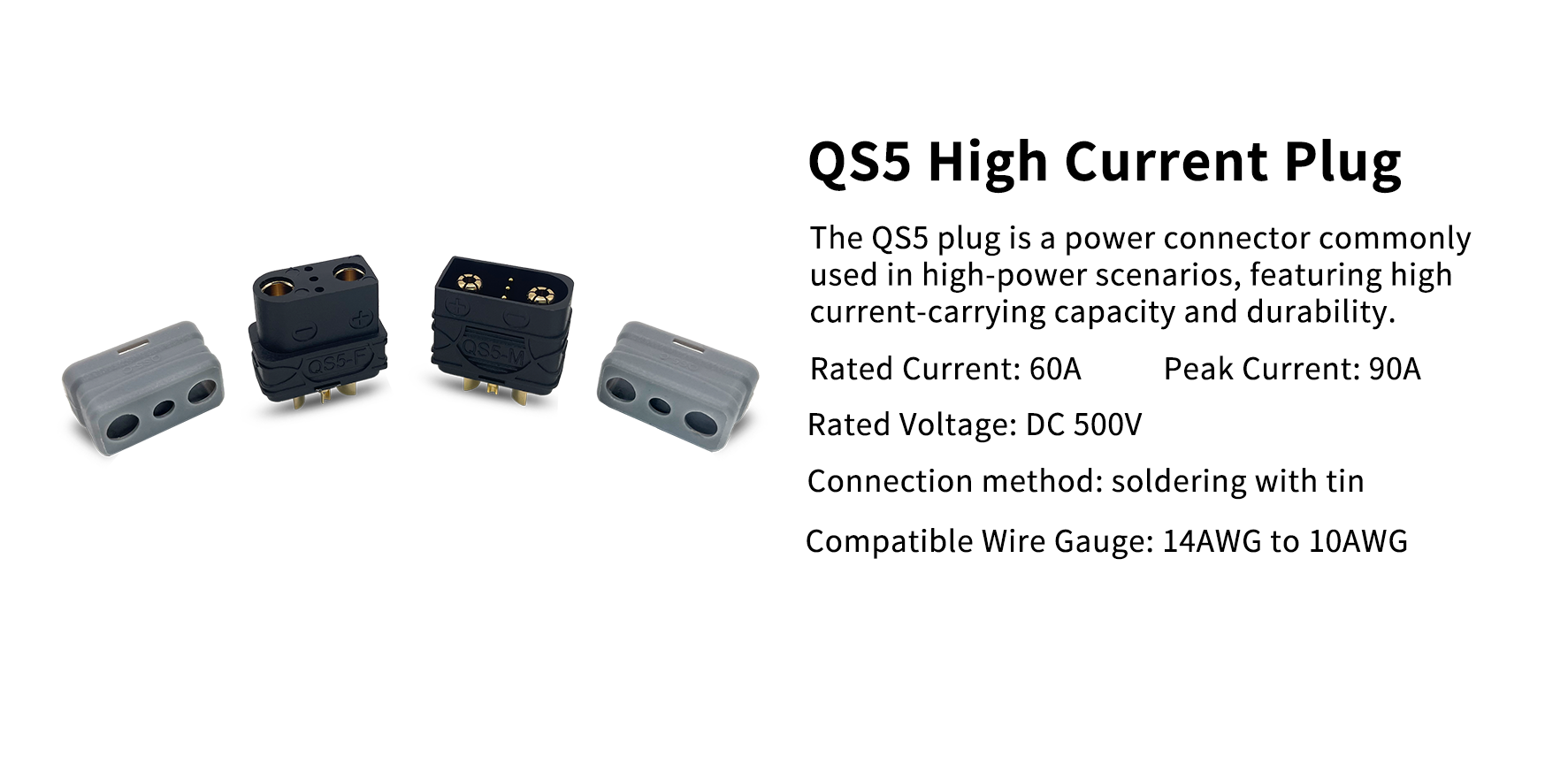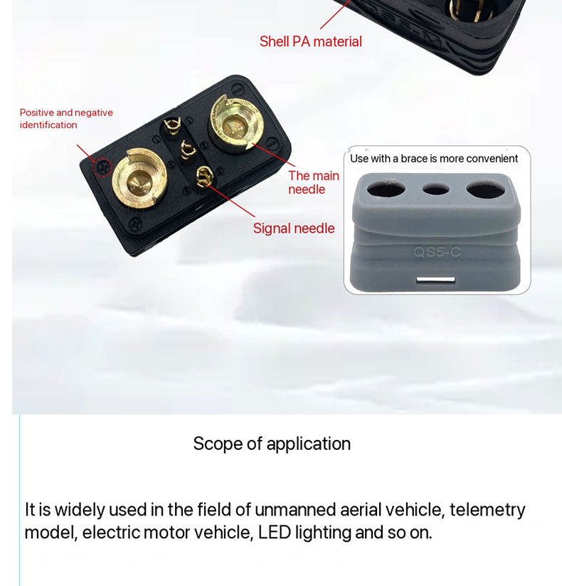 The DC500V QS5 high-current plug is a heavy-duty connector designed for high-voltage and high-current applications, commonly used in electric vehicles (EVs), high-power e-bikes, scooters, and industrial battery systems.